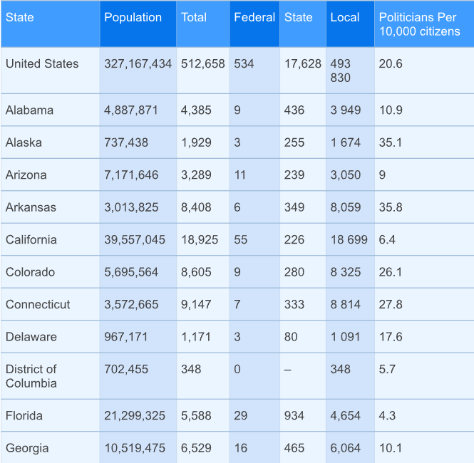 There are 519,682 elected officials in the US. 96% of them hold local, 3.6 state and 0.1%feseral offices.