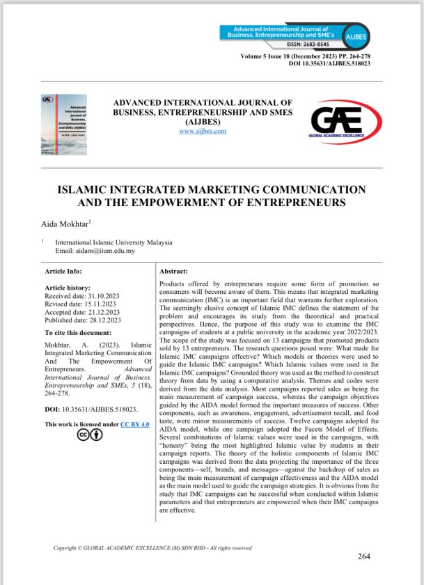 - Dr. Aida Mokhtar is an Associate Professor in the Department of Communication at AHAS KIRKHS, IIUM. Her research interests include Islamic advertising, advertising regulations, integrated marketing communication, and social communication.
