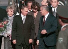 Russian President Vladimir Putin flanked by his wife Ludmila listens to Uzbek President Islam Karimov after arrival at Tashkent's airport 18 May 2000 |