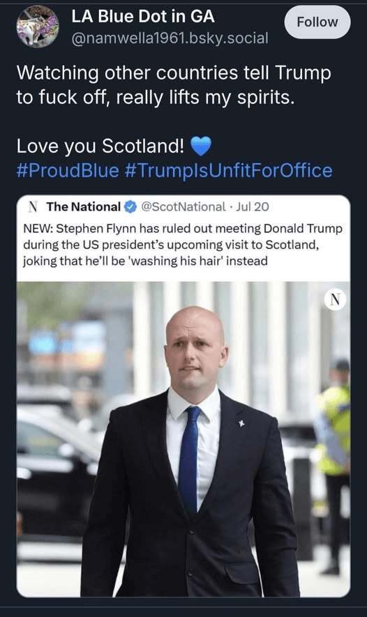 While activists risk their lives at sea, Trump struts through Scotland like a peacock. Unsurprisingly, his presence there was met with ridicule. Scottish MP Stephen Flynn mocked Trump, saying he couldn't meet him because he was "busy washing his hair"-even though Flynn is bald.
