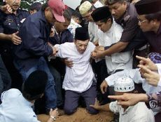 Jailed ex-Malaysian deputy premier Anwar Ibrahim is held by prison guards, police officers and his aide as he kneels in front of his mother's grave during a funeral ceremony at a cemetery in Kuala Lumpur 04 April 2001. Anwar was allowed to attend his mother's funeral with hundreds of supporters showing up for the event. |
