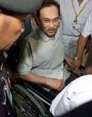 Ex-deputy premier Anwar Ibrahim arrives at the University Hospital in a wheelchair in Kuala Lumpur 03 April 2001. |