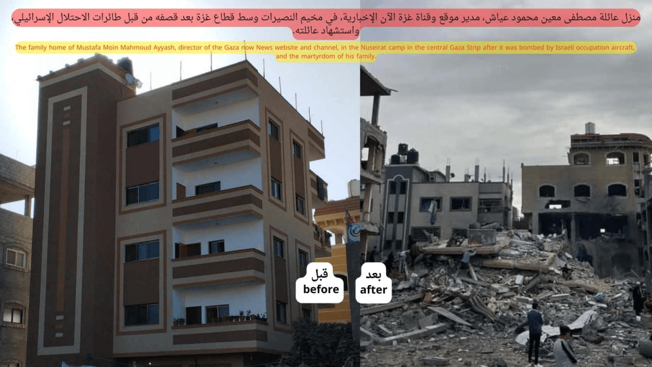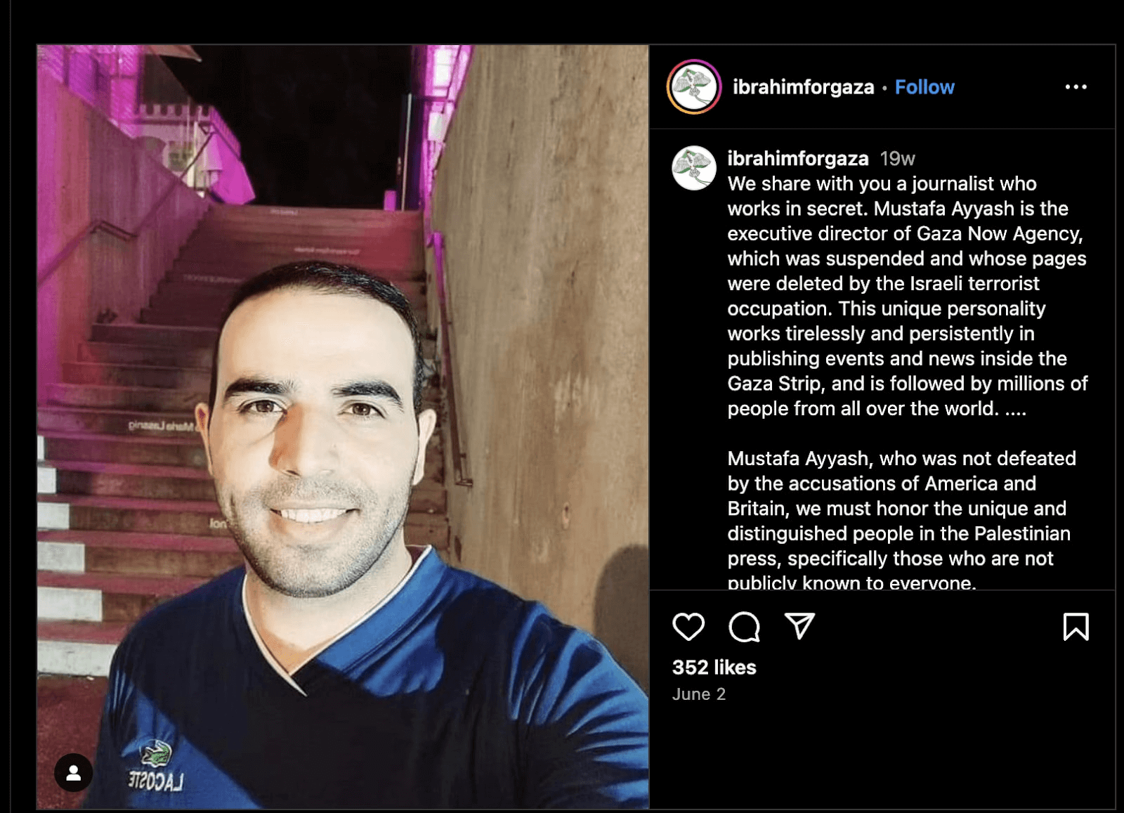 Mustafa Ayash is the founder and director of the Gaza Now News agency, which has 1.81 million followers. Like all other journalists, doctors, scholars, teachers, and infants on incubators, the IDF accused them of being Hamas members or providing material and technical support to Hamas. Most of the time, the IDF justified killing civilians in Gaza because they voted for Hamas-even though most of the victims were not even born or eligible to vote during the 2006 first Palestinian election, which Hamas won.