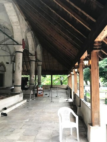 The portico is composed of two distinct sections: an inner, domed segment directly adjoining the mosque, and an outer, complementary extension covered by a sharply pitched wooden roof sheathed in lead sheets, echoing the cladding of both the three smaller domes of the inner portico and the mosque's central dome. What distinguishes this second, sloped-roof portico is its structural articulation: unlike the Karađoz Beg Mosque and the Nesuh-aga Mosque, where stone columns are employed, the Koski Mehmed Pasha Mosque features fourteen square-sectioned wooden columns set upon stone foundations. This material and geometric divergence introduces a tactile, soothing contrast that deepens the ensemble's vernacular resonance. Historically, only two mosques originally featured such secondary, sloped-roof porticoes: the Karađoz Beg Mosque and, in evident emulation, the Koski Mehmed Pasha Mosque. The analogous structure at the Nesuh-aga Mosque represents a subsequent addition, as previously noted.