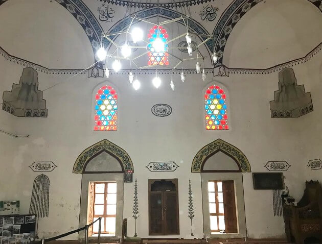 The interior of the Koski Mehmed Pasha Mosque is remarkably illuminated by natural light, a feat achieved through the presence of twenty-five windows: eight encircling the base of the dome, five each on the qiblah wall and the lateral flanks, and two on the rear wall. These windows are distributed across three vertical tiers - two at the lowest level, two at the intermediate, and one at the uppermost - culminating in the dome's luminous ring of eight apertures. The rear wall, by contrast, contains only two windows at its base.