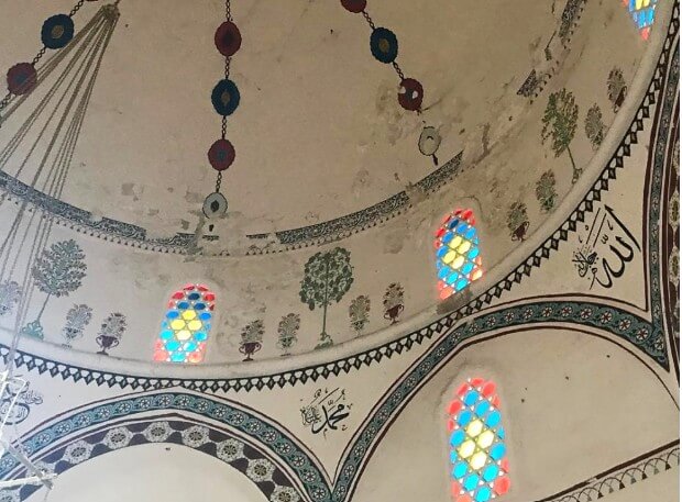 The Koski Mehmed Pasha Mosque stands among several mosques in Mostar and across Bosnia and Hercegovina that incorporate tree motifs as integral elements of their decorative systems. Painted on the interior walls are stylized representations of cypress trees and weeping willows only. However, a broader array of vegetal imagery appears at the base of the dome, where, between each pair of windows, a decorative tree is flanked by two vases containing floral bouquets, possibly carnations, roses, or tulips. Notably, these trees do not emerge from the vases themselves but from abstract, stylized mounds or soil-like forms, suggesting a symbolic grounding rather than a literal botanical origin.