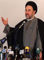 Iranian President Mohammad Khatami gives an emotional speech in Tehran 04 May 2001 to announce that he will stand for re-election next month. The 57-year-old cleric, whose moves to liberalize Iran have been bitterly opposed by the conservative establishment, said he would have ideally preferred to serve the nation in some other capacity, adding that there was still a 'heavy price' to pay for democracy in Iran. |