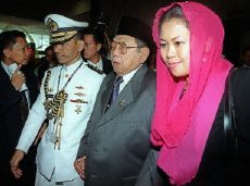 Indonesian President Abdurrahman Wahid (C), accompanied by his daughter Zanubah Chafsyoh (R) and his adjutant (L) arrive at the Jakarta Hilton Convention Center 30 May 2001, to attend the G-15 meeting. The Indonesian parliament has voted to continue a key session which could pave the way towards impeaching President Abdurrahman Wahid. |