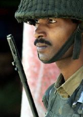 | A soldier from the Border Security Force (BSF) stands guard at Srinagar's main commercial hub Lal Chowk, 09 July 2001. Security has been beefed up in Jammu and Kashmir ahead of the historic 14-16 July India-Pakistan summit. The territorial dispute over Kashmir, which has triggered two wars between South Asian rivals India and Pakistan, will be the focus of talks during summit. |