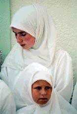 Two young Muslim girls, members of a choir, attend the opening ceremony of the mosque in Gradiska, 80 km north of Banja Luka, Saturday 14 July 2001. Several hundred Bosnian Muslims gathered in the Serb-run town of Gradiska on Saturday for a ceremony to mark the inauguration of a mosque that was rebuilt after being destroyed during the 1992-95 war. The original Obradovacka mosque, built three centuries ago, was destroyed by Bosnian Serbs during the war along with other nine mosques in Gradiska. |