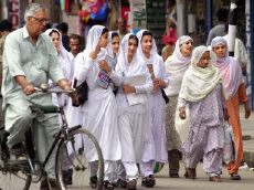 Kashmiri women, young and old, walk a busy Srinagar street with their heads covered, 09 August 2001. An overnight acid attack on two young unveiled Muslim women in Indian Kashmir has sparked fears of a campaign to enforce Islamic dress codes in the region. |