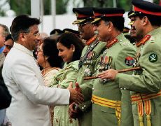 Pakistani President General Pervez Musharraf (L) shakes hand with top military official, General Mehmood (2nd R), the chief of Inter Services Intelligence (ISI), after a flag hoisting ceremony to mark the country's 54th Independence Day in Islamabad, 14 August 2001. Musharraf said Pakistan would continue its dialogue with India and offered to go any length to resolve the Kashmir dispute and other issues with its rival neighbour. |