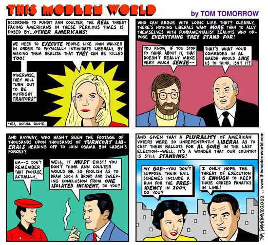 Instead, George W. Bush helpfully fills in the gaps, pointing out that it's a bin Laden job, carried out because bin Laden doesn't like democracy, and that what needs to be done to prevent future attacks it is to line up behind Bush's war on terrorism, applaud the abridgment of civil liberties, and channel more money away from social services to the Pentagon, while accelerating tax cuts for the wealthy.