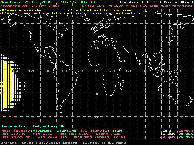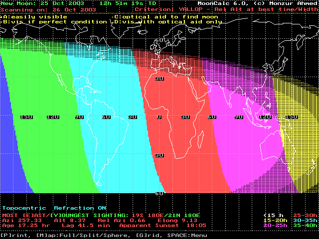 The geocentric new Moon will occur Inshallah on Saturday (25 October 2003), at 12:50 UT. On this day the program Moon Calculator by Dr. Monzur Ahmed - according to Yallop criterion - showed that it is not possible to see the crescent except from the western parts of the Pacific ocean by optical aid only (fig. 1). While on the next day (Sunday 26 October 2003) the crescent should be seen by naked eyes mostly from all the countries. (fig. 2)