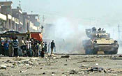 | A U.S. Army Bradley vehicle patrols through the impoverished Baghdad suburb of Sadr City April 6, 2004 |