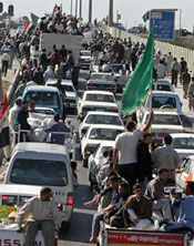 | Iraqi volunteers drive with supplies towards areas under siege by U.S. forces in the restive town of Fallouja, from depots in a Baghdad suburb. |