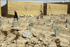 Smeared in hand-written Arabic lettering on the stone markers were the names of Amal and Mustafa Alawi, killed in the Hay Julan district, a poor neighborhood in Falluja where much of the fighting has taken place.