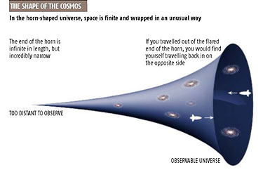 But if the team at Ulm is right, scientists will have to abandon one of the fundamental tenets of cosmology - that all parts of the cosmos are about the same. Holger Then, a member of Professor Steiner's team, told New Scientist: "If one happens to find oneself a long way up the narrow end of the horn, things indeed look very strange, with two very small dimensions."
