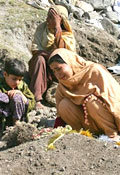 | A Kashmiri woman grieves for her family member, killed by the October 8 earthquake, beside a new grave in a mountain village of Comsar in the Neelum Valley, north of Muzaffarabad. |