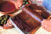 For a Mexican, this was no trivial matter. Laborious to produce, mole is served for weddings, festivals and national holidays. The legend of its origin in the convents of 18th-century Puebla, the second city of New Spain-as Mexico was then called-is part of the nation's popular history, recounted time and again in newspapers, school textbooks, guidebooks and even on paper placemats in restaurants. Mole comes in many varieties, but it usually contains ingredients such as cinnamon, cloves, peppercorns, anise, coriander, chocolate, chiles, almonds, pumpkin seeds, raisins, bread and tortillas-all ground together and cooked in a light broth to make a harmonious brown sauce that is served with turkey, chicken or vegetable dishes.