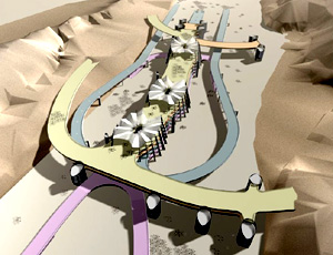 The bridge is 950 meters (over 3,000 ft) long and 80 meters wide. It consists of five floors each of which is 12 meters high. The entire project is designed to expand up to 12 stories in the future when the need arises.