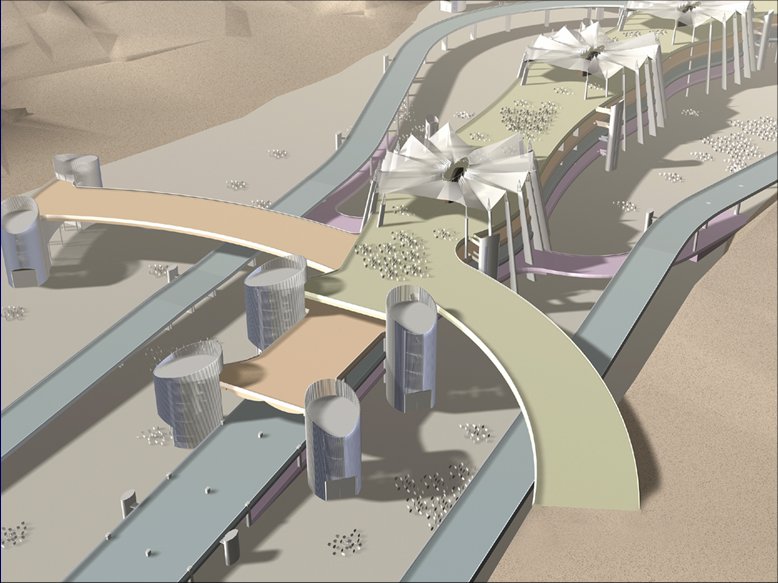 The Jamarat Bridge also includes subways for underground vehicular traffic to provide more space for pedestrians in the bridge areas in addition to six exits for emergency evacuation through six emergency towers leading to the ground floor and tunnels as well as to the helipads.