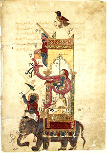 | Illustration of the Elephant Clock from the Book of Ingenious Devices. | Re-engineered Elephant Clock at the Ibn Batuta Mall in Dubai. |