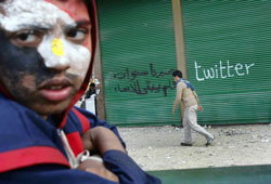 | Graffiti in Tahrir Square hints at the importance of social media websites such as Twitter and Facebook in rallying protesters in Egypt. However, some observers cautioned against assigning too much credit to the role of the Internet. |