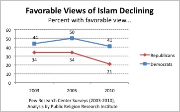 For example, in 2003, the partisan divide on attitudes towards Islam was 10 points: 44 percent of Democrats held a favorable view of Islam, compared to 34 percent of Republicans. By 2010, the partisan gap had doubled to 20 points: approximately 4-in-10 (41 percent) Democrats still held a favorable view of Islam, but the percentage of Republicans who held a favorable view of Islam had fallen precipitously to 21 percent (Pew Research Center, 2003-2010).