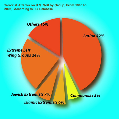 The Islamophobes claim that Islam is intrinsically a terrorist religion. The proof? Well, just about every terrorist attack is Islamic, they retort. Unfortunately for them, that's not quite true. More like six percent. Using their defunct logic, these right wingers ought now to conclude that nearly all acts of terrorism are committed by Latinos (or Jews). Let them dare say it...they couldn't; it would be political and social suicide to say such a thing. Most Americans would shut down such talk as bigoted; yet, similar statements continue to be said of Islam, without any repercussions.