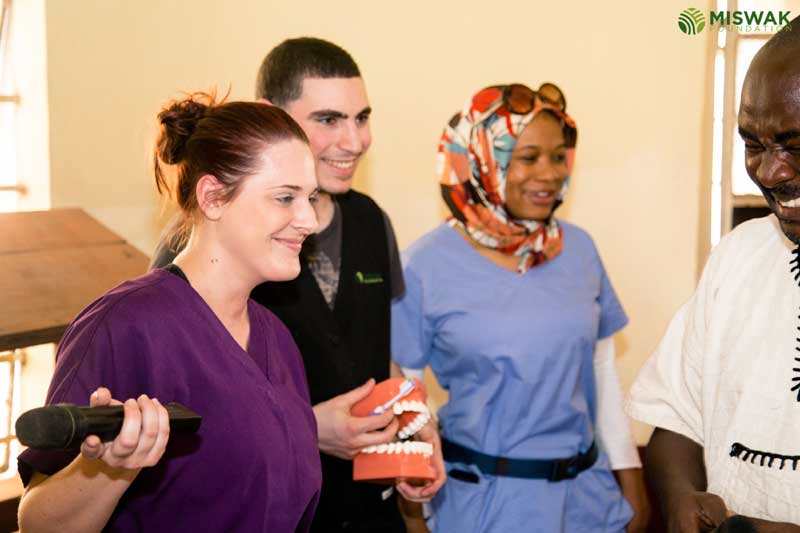| Miswak Foundation volunteer Jordan Farnham providing valuable oral hygiene instruction to a Friday congregation in Calaba Town |