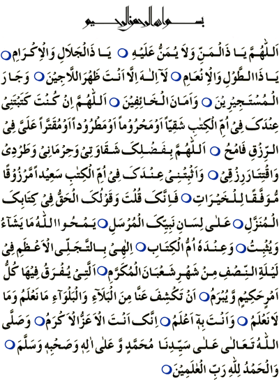 | Transliteration Allahumma ya Dha 'l-Manni la yamannu 'alayhi ahad, ya Dha 'l-Jalali wa 'l-Ikram ya Dha 't-Tuli wa 'l-An'am. La ilaha illa Anta. Ļahara 'l-laji'īn wa Jaru 'l-mustajirin wa Amanu 'l-kha'ifīn. Allāhumma in kunta katabtanī 'indaka fī ummu 'l-Kitābi shaqiyan aw mahruman aw matrudan aw muqataran 'alayya mina 'r-rizq famhu-llahumma bi-faļlika shaqawati wa hurmani wa ţurdi wa iqtara rizqi wa thabitni 'indaka fi ummi 'l-kitabi sa'idan wa marzuqan li 'l-khayrati fa-innaka qulta wa qawluku 'l-haqq fī kitabik al-munzal 'ala lisani nabiyyika 'l-mursal: yamhullahu ma yasha'u wa yuthbitu wa 'indahu Ummu 'l-Kitab. Ilahi bi 't-tajalli al-a'azhami fī lalayti 'n-nisfi min shahri sha'bani 'l-mu'azhami 'l-mukarrami 'llati yufraqu fīha kullu amrin hakimin wa yubram, an takshifa 'anna mina 'l-bala'i ma na'lamu wa ma la na'lamu wa ma Anta bihi a'alamu innaka Anta al-A'azzu 'l-Akram. Wa salla-Allahu 'ala sayyidina Muhammadin wa 'ala alihi wa sahbihi wa sallam. Alhamdulillahi Rabbil Aalameen |