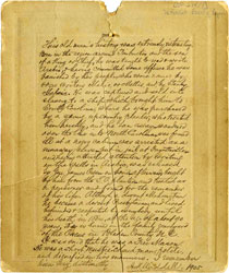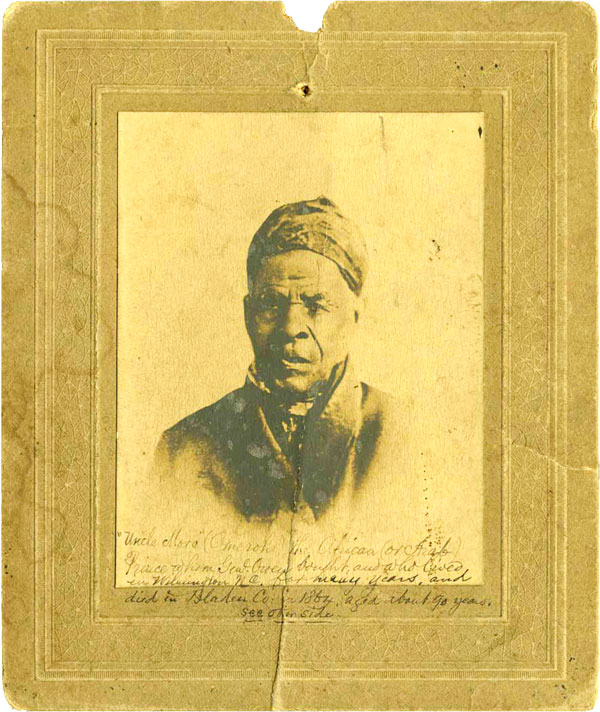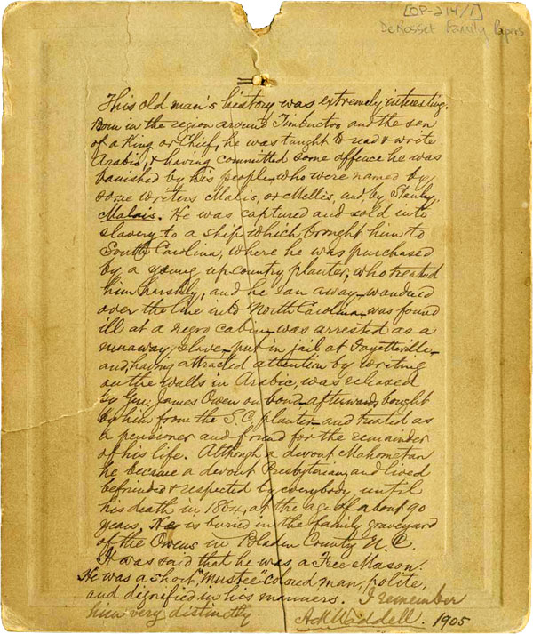 | Inscription on the reverse side of the portrait: This old man's history was extremely interesting. Born in the region around Timbuctoo and the son of a King or Chief, he was taught to read & write Arabic, & having committed some offence he was banished by his people who were named by some writers Malis, or Melles, and by Stanley, Malais. He was captured and sold into slavery to a ship which brought him to South Carolina, where he was purchased by a young upcountry planter, who treated him harshly, and he ran away, wandered over the line into North Carolina, was found ill at a negro cabin, was arrested as a runaway slave, pit in jail at Fayetteville, and having attracted attention by writing on the walls in Arabic, was released by Gen. James Owen on bond, afterward bought by him from the S. C. planter and treat as a pensioner and friend the remainder of his life. Although a devout Mahometan he became a devout Presbyterian, and lived befriended & respected by everybody until his death in 1864, at the age of about 90 years. He is buried in the family graveyard of the Owens in Bladen County N. C. It was said that he was a Free Mason. He was a short "Mustee" colored man, polite, and dignified in his manners. I remember him very distinctly. AM Waddell. 1905 From The DeRosset Papers, the Southern Historical Collection - University of North Carolina at Chapel Hill |