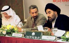 Iraqi opposition leader Ayatollah Sayed Taqi al-Modaressi (R) speaks 14 May 2000, on the second day of a seminar held in Kuwait City on the political changes in Baghdad and their implications for future ties. Sitting next to him is Arab-American researcher Ahmad Karawan (C) and Kuwaiti state minister for foreign affairs, Sulaiman Majed al-Shaheen. Iraq has blasted the forum as an aggression on Baghdad. |