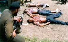 An Indian army soldier looks at the bodies of three Kashmiri Lashkar-e-Taiba fighters in Ponychak 17 August 2001, after they were shot dead by Indian troops, as they were trying to cross the border into Indian-occupied Kashmir. |