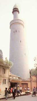 Over 2400 kilometers (1500 miles) from Beijing and only a short train ride from Hong Kong, Guangzhou has always been more open to foreign influence than other Chinese cities, and its mosque is generally considered to be the oldest in China. Said to have been founded by one of the first Muslim missionaries to China some 1300 years ago, Huaisheng Mosque displays a mixture of architectural styles: a 36-meter (118-foot) cone shaped minaret, built during the Tang Dynasty (618 - 906), towers over a cloistered court-yard and the sweeping tiled roofs of the prayer hall, rebuilt to replace the original that was destroyed by fire in 1343. It is also known as the Beacon Tower mosque, because during the Tang and Sung Dynasties, when the Pearl River flowed close to the minaret - before silting shifted it away - a light was hung at night from the top of the tower for navigational purposes.