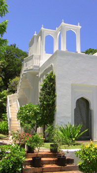 Arriving at Shangri La, one is struck by what you don't see. There are none of the ostentatious signs of wealth that overwhelm you at, say, a San Simeon or Millionaires' Mile in Newport. Once you pass through a locked gate, the driveway winds its way down a gentle slope to a parking area that circles a giant banyan tree. To the right is a simple wall and door. Face ahead, toward the sea, and there's a plain faade with a single door guarded by two stone camels.