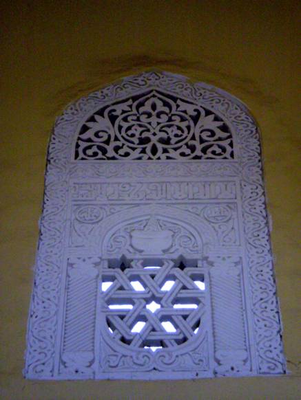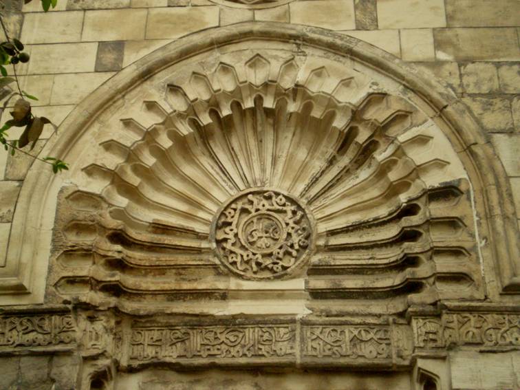In the whole of the mosque, in addition, there are 25 elaborately decorated stucco window grills with the names of Muhammad and 'Ali etched inside two small discs placed almost in the middle on the right and left of each grill. Inside the right disk is the name of Muhammad and in the left one the name of 'Ali. Of those 25 intricately embellished stucco window grills, 23 face the interior of the mosque and two the exterior. The latter is part of the rich decorative style and language of the mosque's front facade. And finally, above the praying niche or mihrab of the mosque, tributes for the Fatimid (Isma'ili) Imams and caliphs are evidenced.That said, ornamental deep and shallow niches, as well as flat arches, with their hoods composed of radiating flutes with or without circle medallions being placed either in the center or independently next to those niches and arches -- irrespective of whether there are inscriptions or not in the midpoints of those medallions - denote, perhaps, the most recognizable features of the Fatimid art and architecture.