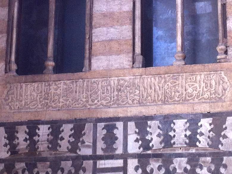 The complex of the Mamluki Sultan Qansuh al-Ghuri (d. 922 AH / 1516 CE) could be taken as an interesting illustration. The complex contains a portion of the al-Fath or Victory Qur'anic surah or chapter both on the inside and outside facades of some of its component buildings. The complex likewise contains inside as well as outside a proclamation that in a way represents the core of the Sunni creed. The proclamation asserts the unity or tawhid of God, the prophethood of Muhammad (pbuh), and then implores God to bless and protect the family of the Prophet (pbuh) (ahl al-bayt) and all of the Prophet's companions (sahabah). The complex of al-Ghuri and its decorative aspects become all the more significant on account of its strategic location. The complex buildings flank the street of al-Mu'izz Li-Dinillah, the main artery of the Fatimid Cairo. The complex is also in the vicinity of the al-Azhar mosque. It consists of a mosque-madrasah, a Sufi khanqah, a caravanserai, a mausoleum, a sabil (public fountain) and a kuttab (school for beginners). Similar assertions of Sunni faith - albeit only once - are found inside the madrasah of the Mamluki Sultan al-Ashraf Barsbay (d. 842 AH / 1438 CE) as well, which lies just a stone's throw away from the complex of al-Ghuri, on the western side of the al-Mu'izz Li-Dinillah street.