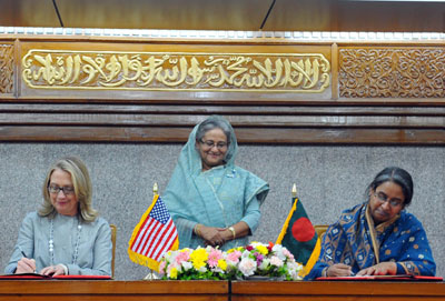 | Secretary Clinton meets senior Bangladeshi officials, Prime Minister Sheikh Hasina, center and Foreign Minister Dipu Moni, right. |