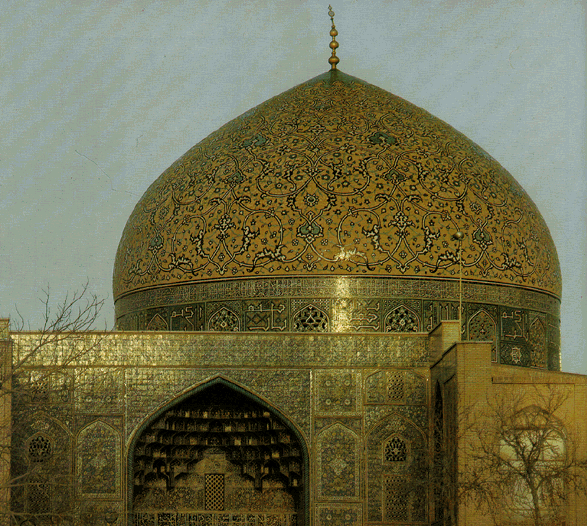 Photo: Persia's greatest contribution to ornament, gloriously colored enameled tile, faces the dome and stalactite portal of Shaykh Lutf Allah Mosque, built in the early 1600s on Isfahan's vast royal plaza.