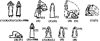 Al-Maghrib | Salat Al-Isha Click on the picture below to watch the video (I)Allah is Great. (A) Praise and glory be to you O Allah. Blessed be Your Name, exalted be Your Majesty and Glory. There is no God but You. (B) I seek Allah's shelter from Satan, the condemned. (C) In the Name of Allah, the Beneficent, the Merciful. (D) Praise be to Allah, The Cherisher and Sustainer of the Worlds; (E) "Glorified is my Lord, the Great". (F) Allah Listens to him who praises Him" (G) "Our Lord, praise be for you only". (H) "Glorified is my Lord, the Exalted" (I) O my Lord forgive me and have Mercy on me" (J) "All our oral, physical and monetary ways of worship are only for Allah. Peace, mercy and blessing of Allah be on you, O Prophet. May peace be upon us and on the devout slaves of Allah. I testify that there is no God but Allah and I testify that Muhammad is His slave and messenger". (K) "O God send your mercy on Muhammad and his posterity as you sent Your mercy on Abraham and his posterity. You are the Most Praised, The Most Glorious". (K) "O God, send your Blessings on Muhammad and his posterity as you have blessed Abraham and his posterity. You are the Most praised, The Most Glorious". (L) "Our Lord, grant us the good of this world and that of the Hereafter and save us from the torture of hell. (M) Peace and mercy of Allah be on you". INSTRUCTIONS FOR PERFORMING PRAYERS HOW TO PRAY TWO RAKA'S position 1: this posture is called Qiyam and it is assumed after having made the intention to pray. Raising both hands upto the ears (palms facing the Qiblah) "Allah-o-Akbar" (1) is said and then holding the left hand with the right hand on top. This position is assumed as shown in position 1. In this position the following prayers are recited: (A) Thana (B) Ta'awaz (C) Tasmia (D) Al-Fatiha, and any short sura or a few verses from the Holy Quran. position 2: Saying Allah-o-Akbar this position is assumed as shown in the position. This position is called 'Ruku' and the prayers as given under (E) are recited. position 3: While going back to "Qiyam" position the prayer as given under (F) is said. Then having taken this position prayer (G) is said. position 4: This position is called 'Sajda'. Saying Allah-o-Akbar one prostrates as shown and then prayer (H) is said. position 5: Saying Allah-o-Akbar and rising from the 'Sajda' position this posture is assumed and prayer (I) is said. position 6: Saying Allah~~Akbar the Sajda position is resumed and prayer (H) is recited. This completes one 'Raka'. position 7: Saying Allah-o-Akbar this position of 'Qiyam' is assumed once again to begin the second Raka, and the following prayers are recited: (1) 'Al Fateha' as given under (D) and position 8: In this posture these prayers are to be recited In order to perform a FOUR RAKA' PRAYER Positions 1-6 complete the first raka' then positions 7,1 through 6, and 8 complete the second raka'. In position 8 only prayer (J) will be recited and the Qiyam position 1 will be resumed. In position 1 only prayer (D) will be recited without adding any sura. Up to Figure 6 all the prayers are the same as in the first raka'. In Figure 8 only prayer (D) will be recited. Then from position 2-6 all prayers are the same as given for each posture. In position 8 prayer (J), (K), (L) will be recited. Then positions 9-10 are to end the prayer. |