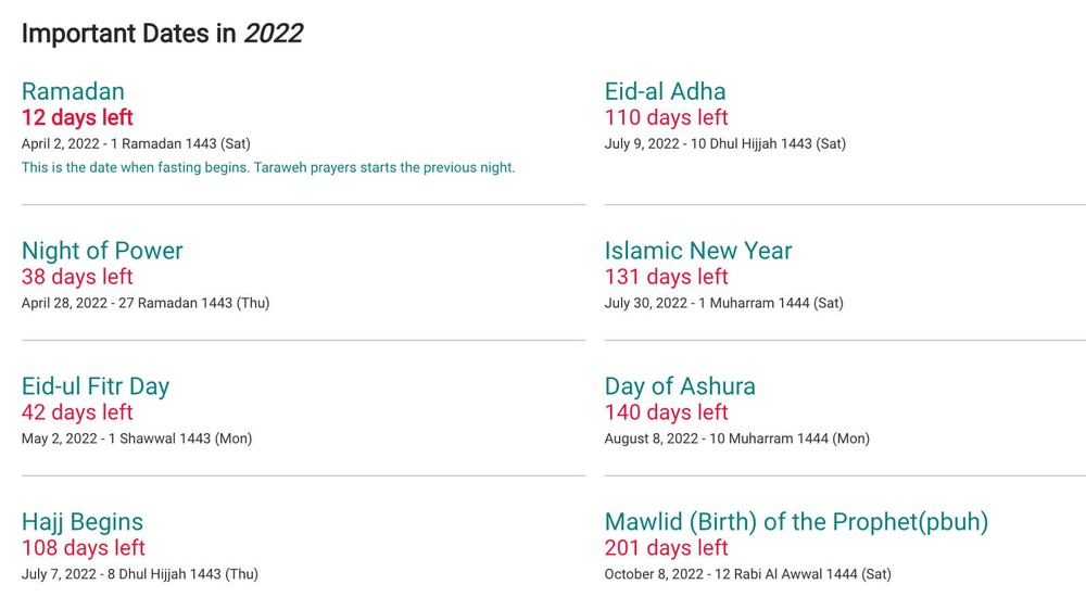 Keep track of important Islamic dates. This is a dynamic calendar that will let you know how many days left for important Islamic dates.
